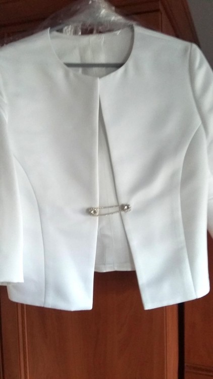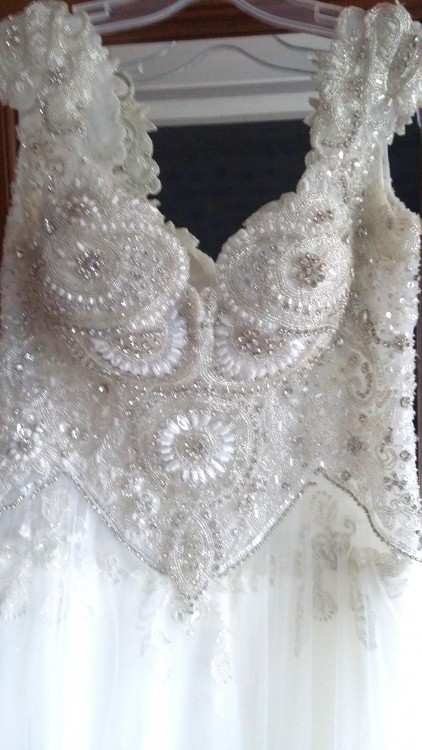 Sprzedam suknię ślubną model Maxima 6716 w stanie bdb, po praniu chemicznym oraz wszelkich naprawach związanych z dołem sukni (dziurki po tańcu w tiulu). Suknia posiada tren podpinany na guziczki, gorset z kryształków oraz wszyte miseczki biustonosza. Jest zapinana na zamek, a tiul posiada drobinki brokatu. Suknia została zakupiona za 4750 zł. Dodaję do niej podwiązkę oraz welon (ze zdjęcia- mam dwie podwiązki do wyboru) oraz opaskę do włosów. Mam również bolerko (nowe), które również mogę dodać.