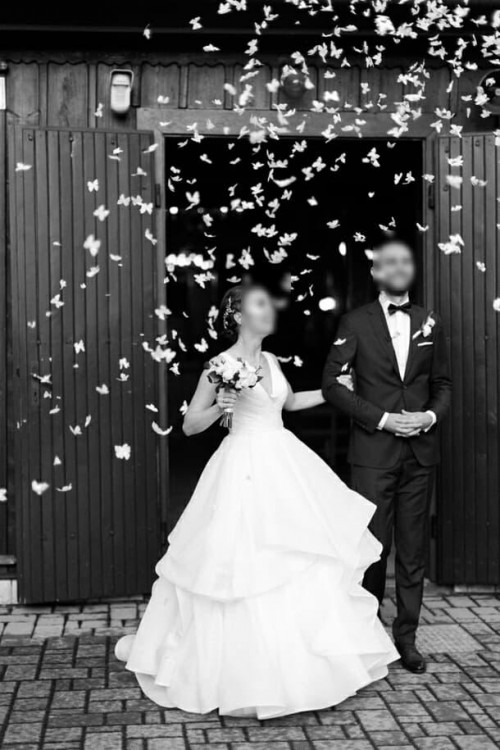 Suknia ślubna rozmiar 34/36, kolor przełamana biel. Wzrost 165 plus 8 cm obcas. Góra sukni to wygodny gorset na ramiączkach, wszyta miseczka C. Na plecach piękne wycięcie w literę V i małe wiązanie (także suknie można precyzyjnie dopasować dzięki wiązaniu). W talii delikatny ozdobny pasek z cyrkonii. Spódnica z pięknymi kaskadowymi falbanami, do tego małe koło pod spodem dla lepszego efektu. Suknia ma tren, idealny do kościoła, później do podpięcia na 3 troczkach. Suknia po praniu chemicznym, jak nowa. POLECAM :)