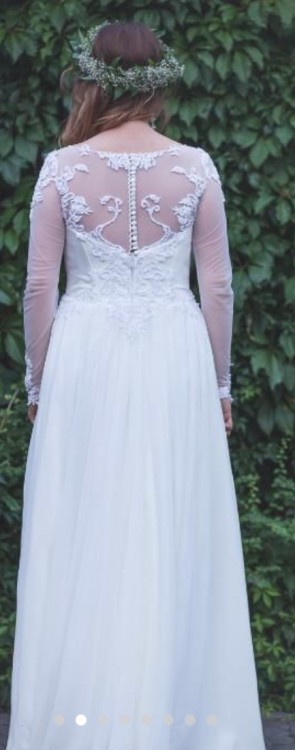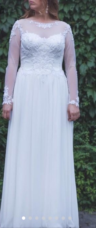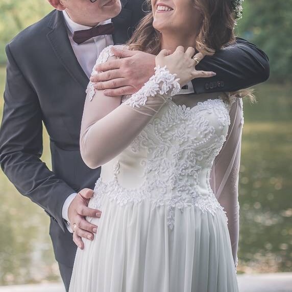 Sprzedam suknię ślubną Maxima Bridal w kolorze ecru, zakupioną w salonie sukien ślubnych Sindrella w Grabowie k. Ostrołęki. Szyta na wymiary 97/78, więc jej rozmiar to jakieś 40/42. Szyta na wzrost 170 cm + 8 cm obcas. Suknia jest zapinana na suwak i guziki. Jest lekka i przewiewna, ma piękne zdobienia. Jest bardzo wygodna. Na żywo naprawdę robi wrażenie. Po weselu i sesji plenerowej została uprana w pralni. Zapraszam do kontaktu. Cena do negocjacji. Dodatkowych informacji mogę udzielić telefonicznie.