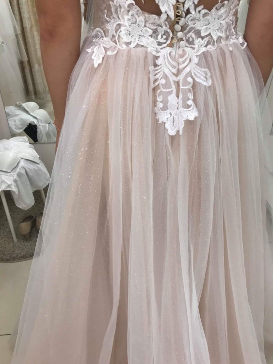Kolor: góra: biel, gorset trzyma się na bardzo delikatnej siatce, która jest niewidoczna na ciele; dół: tiul w szampańskim kolorze z warstwą przepięknie mieniącego się brokatu.