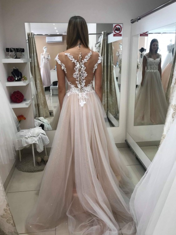 Suknię można dopasować do swojego wzrostu. Piękny krój w kształcie literki A z ozdobnymi plecami zapinanymi na drobne guziczki. Suknia jest lekka i bardzo wygodna, również dzięki temu, że posiada koło z halką z zestawie. Suknia jest w bardzo dobrym stanie, nie ma żadnych zniszczeń. Miałam ją na sobie na weselu i na sesji. Możliwość przymiarki w Opolu.
