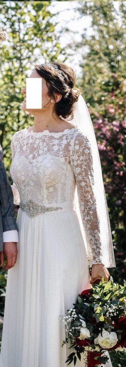 Sprzedam suknię ślubną Fabia renomowanej marki Meliee by Promariage. Suknia uszyta na osobę o wzroście 162 cm plus 7 cm obcas, rozmiar S/XS. Góra delikatna koronka przeźroczysta, dół muślinowy. Jest idealna nie tylko na lato, ale także wiosnę czy jesień (materiał przewiewny), bardzo wygodna. Wyczyszczona.
