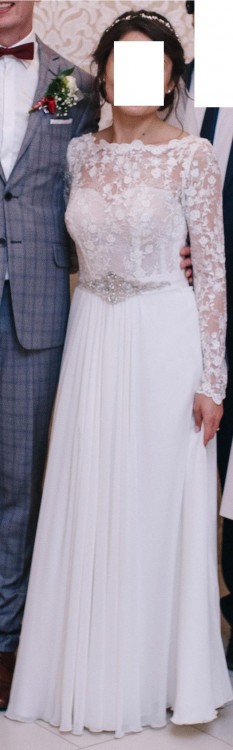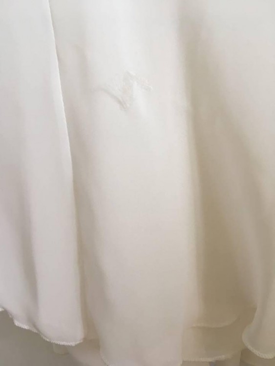 Suknia ma niewielki defekt- delikatne uszkodzenie przy samym dole sukni, możliwe do zniwelowania (załączone zdjęcie).