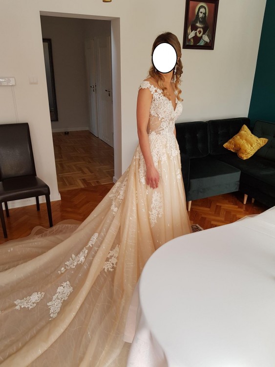 Sprzedam piękną suknie marki Milla Nova model Merion z kolekcji 2019, Suknia w rozmiarze 34|36 na wzrost 167 cm + 10 cm obcas w kolorze ivory|nude z długim trenem podpinanym na guziczki. W gratisie dorzucam długi gładki welon. Więcej informacji w wiadomości prywatnej
