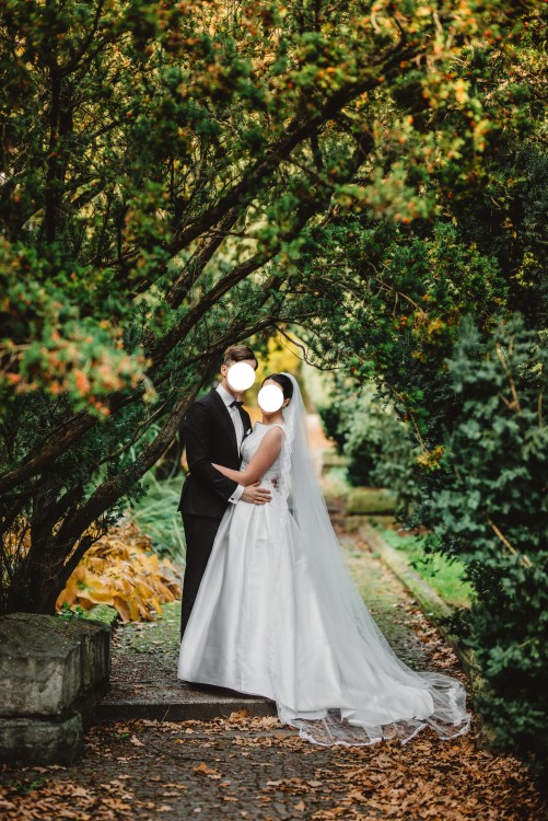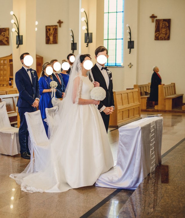 Jestem pierwszą właścicielką sukni, została uszyta na wzrost 172 cm i obcas 7 cm. Suknię założyłam w dniu ślubu oraz podczas sesji - nie posiada żadnych uszkodzeń.