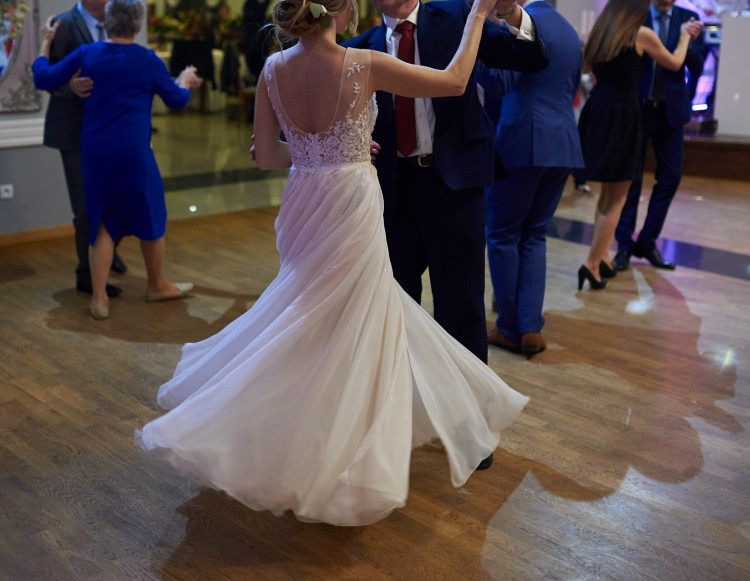 Suknia jest wygodna, lekka, zwiewna, z rozkloszowanym dołem. Suknia jest dwukolorowa, łączy kolory nude z białymi koronkami.