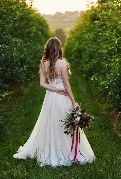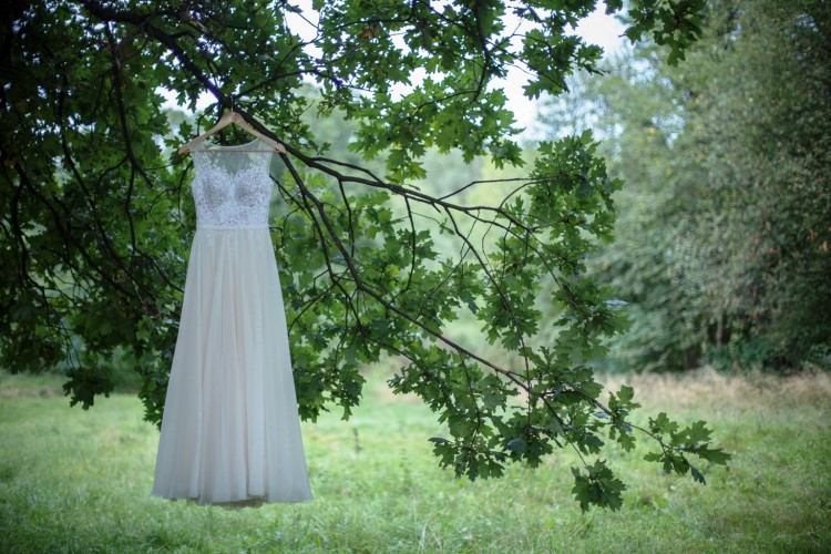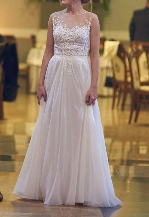 Góra sukni: koronki w kolorze bieli naszyte na miękkim tiulu w kolorze nude, na plecach dekolt w kształcie litery „U”. W talii cienki pasek. Suknia posiada wszyty i niewidoczny biustonosz w rozmiarze 70C. Brak gorsetu.