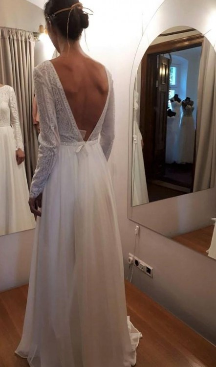 Suknia z długim rękawem z oryginalną koronką, dół z muślinu + tren.