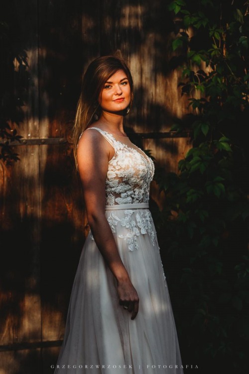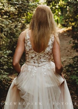 Suknia posiada rozcięcie na nodze przez co jest bardzo wygodna i pięknie układa się w tańcu.