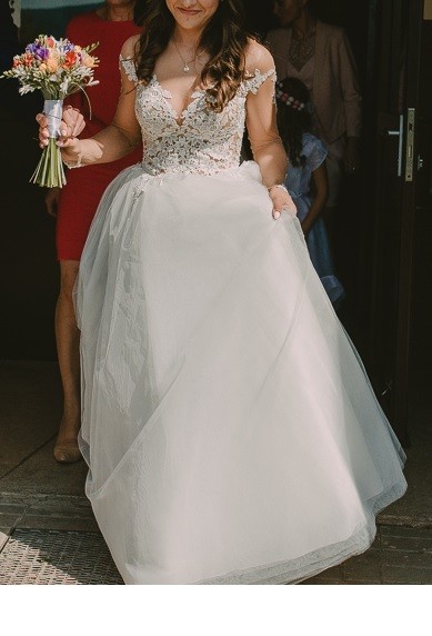 Suknia była robiona na wzrost 165 cm , wysokość buta koło 6 cm. Góra sukni jest zrobiona na cielistym spodzie wyszytym koronkami ,duł tiulowy gładki. Kształt sukni to princeska, Tył zakończony średniej długości trenem,