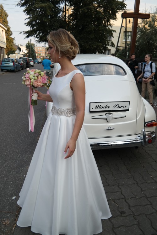 Sprzedam suknię ślubną z materiału mikado z elementami Swarovskiego.