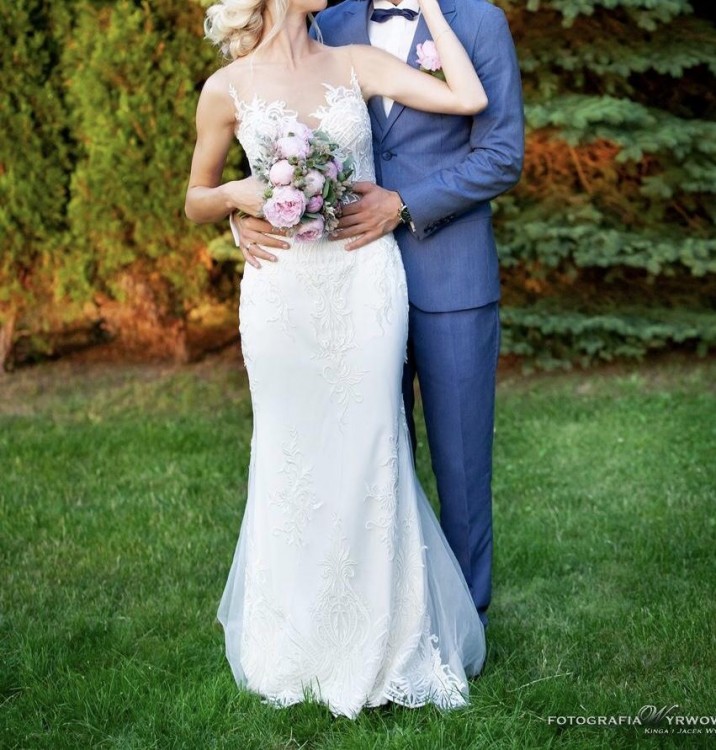 Witam, mam do sprzedania suknie ślubną kupioną w Madonnie, model sukni Milla Nova „BLER” kolor IVORY, rozmiar 36, wymiary 82, 68,92. Suknie można zwęzić lub poszerzyć do 5 cm. Wyprana w pralni chemicznej, wszyte miseczki, posiada długi, podpinany tren. Suknia bardzo wygodna, gorąco polecam!! Więcej informacji na priv.