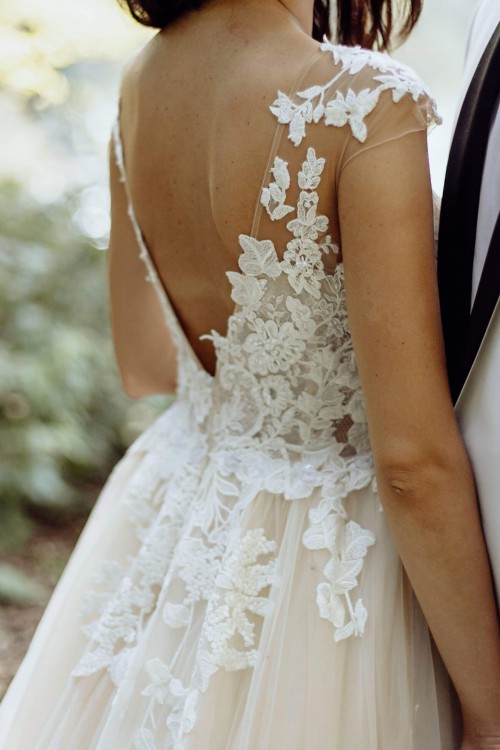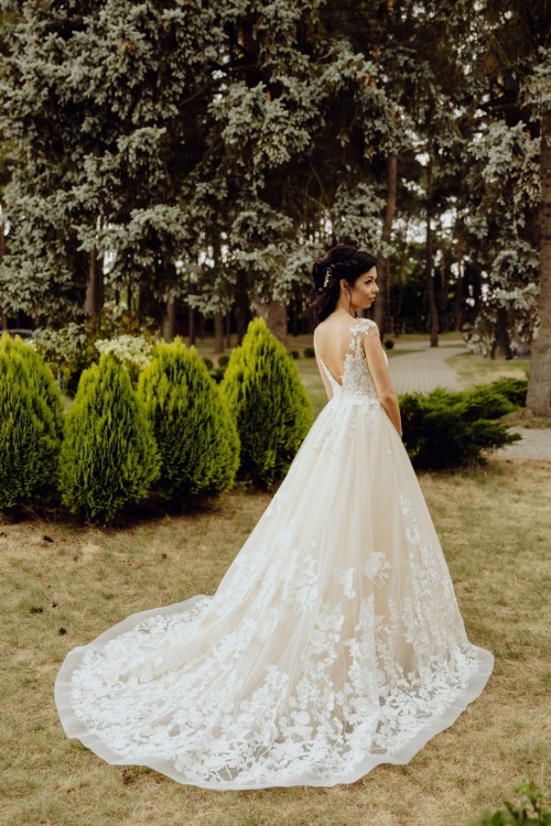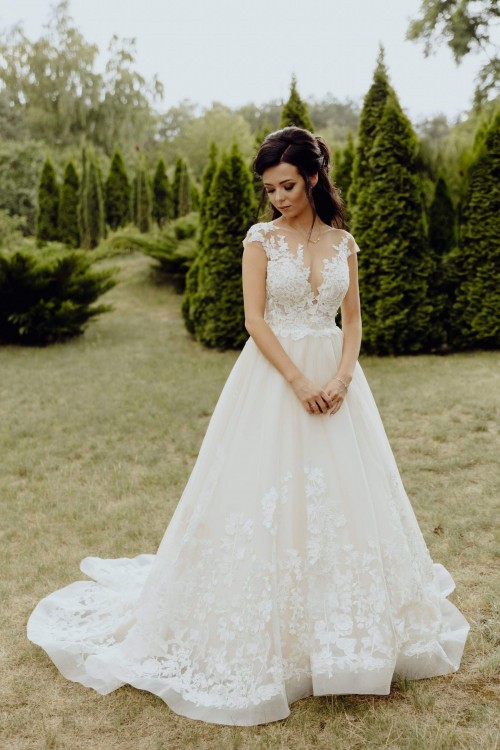 Na gorze suknia ma piękną, lekko połyskującą koronkę z kryształkami i cielistą siateczkę.