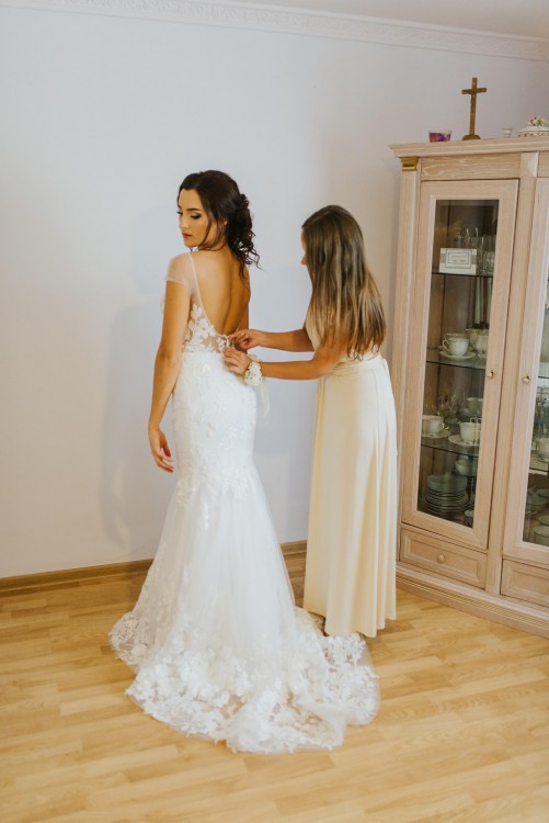 Suknia posiada tren który po podpięciu pięknie wtapia się w całość nie tworząc tzw. "ogonka". bardzo delikatna romantyczna i kobieca , wbrew pozorom bardzo wygodna nic nie przeszkadzało podczas tańca . rozmiar 36/ 38 i szyta na wzrost 175 plus szpilki około 10 cm (możliwość skrócenia), kolor ivory.
