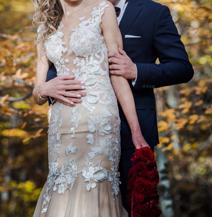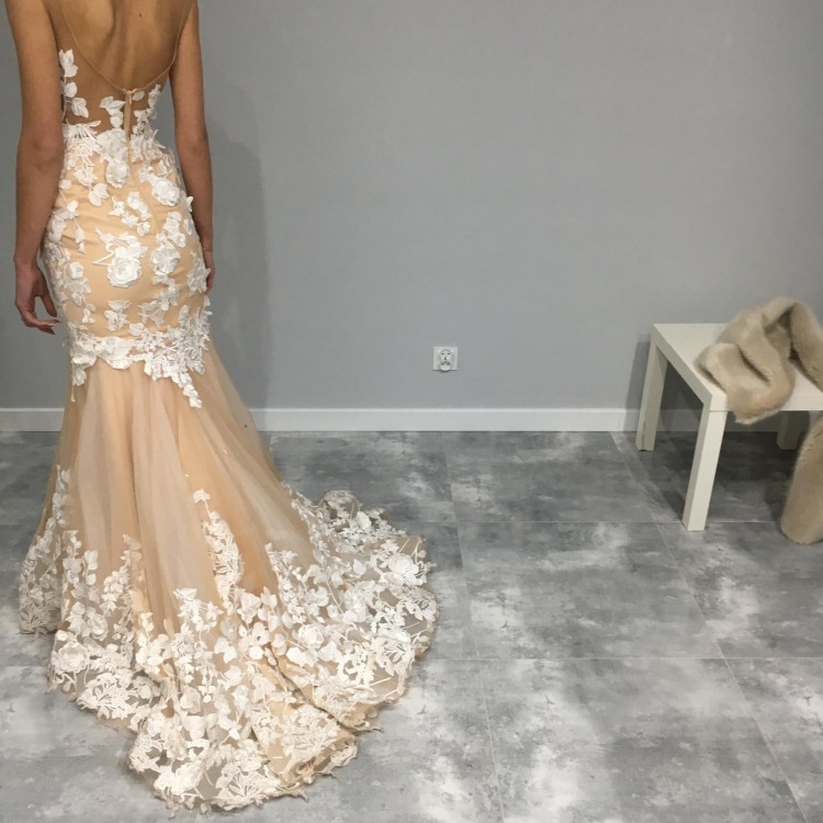 Wspaniała suknia o fasonie syrenki/rybki w kolorze nude, z koronkowymi, ręcznie naszywanymi kwiatowymi aplikacjami 3D.