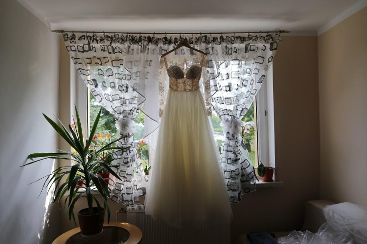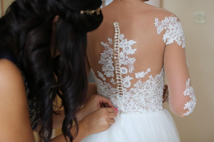 Suknia posiada tren, który jest podpinany za pomocą guzika z tyłu sukni.
