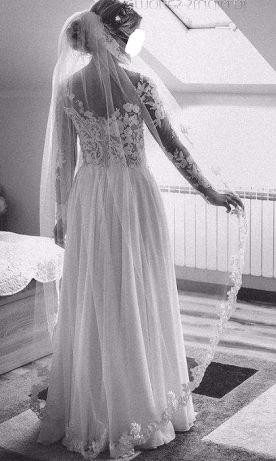 Możliwość zakupu z welonem 1,80 m ozdobionym koronką idealnie pasującą do góry sukienki. Koszt 200 zł (cena sklepowa 550 zł)