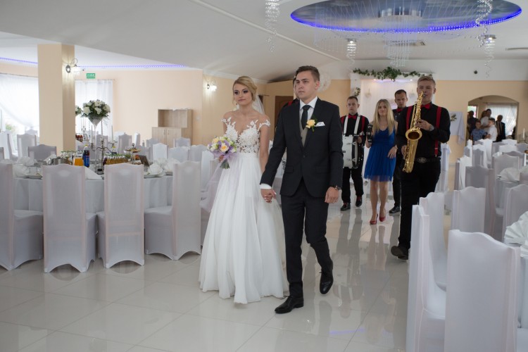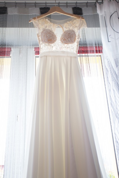 Sukienka posiada pięknie zdobione plecy, muślinowy dół, podpinany tren oraz rozcięcie z lewej strony. Ma małe uszkodzenie na rękawkach powstałe podczas tańca (konkretnie obrotów-gdy musiałam podnieść ręce), ale spokojnie można sobie z tym poradzić. Cena do negocjacji. Więcej informacji pod nr telefonu (kontakt sms).
