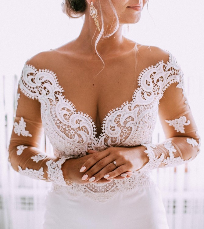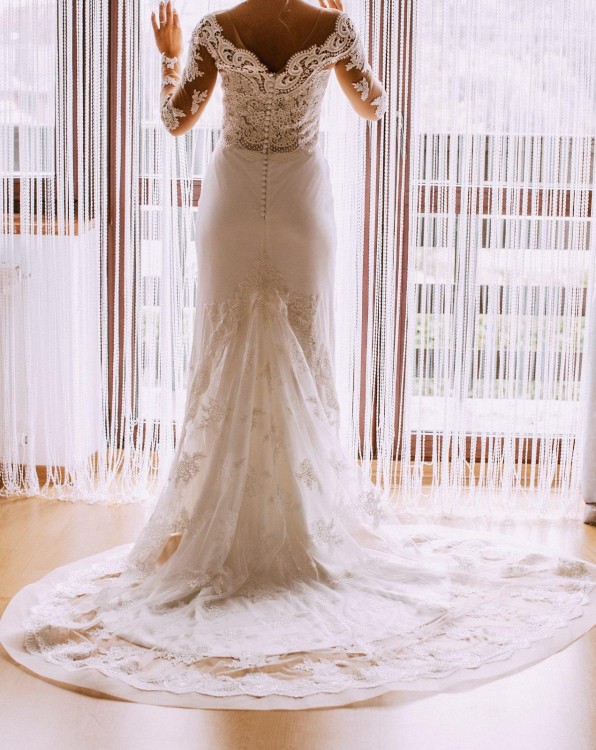Suknia dosłownie olśniła wszystkich gości weselnych dzięki przepięknym ręcznie szytym zdobieniom, hafcie oraz koronce. Góra sukni jest dopasowana dzięki delikatnie przylegającej do ciała siateczce w odcieniu skóry przez co idealnie sprawdzi się na ślub o każdej porze roku.