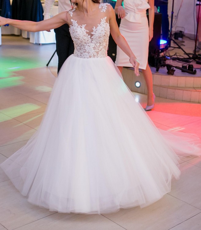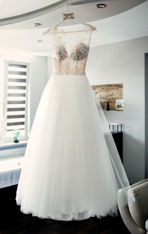 Góra sukni zdobiona z transparentnej siateczki, która zlewa się z ciałem,dół sukni z wysokiej jakości lekkiego tiulu.