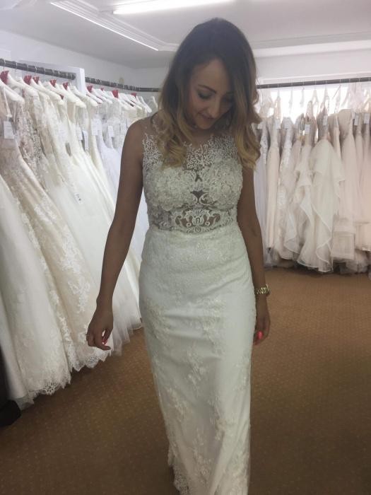Rozmiar z metki to 40, jednak wg polskiej rozmiarówki wychodzi 36-38. Suknia pasuje idealnie na osobę 168 cm +-8 cm obcas. Suknia jest bardzo efektowna i wygodna. Sprzedaje, ponieważ szkoda mi żeby to cudo wisiało w szafie. Niech posłuży innej Pannie młodej