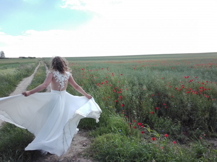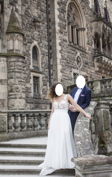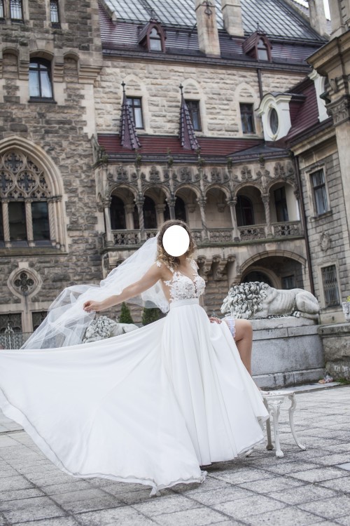 Suknia w rozmiarze 38, kolor Ivory, wzrost 161 cm + 7 cm obcas. Góra sukienki z przeźroczystej siateczki, na ktorej naszyta jest koronka, posiada wszyte miseczki (+ dodatkowo push-up), dół sukienki zwiewny z rozcięciem na udzie na lewej nodze. Posiada tren podpinany na dolny guziczek. Sukienka lekka, świetnie układa się w tańcu.