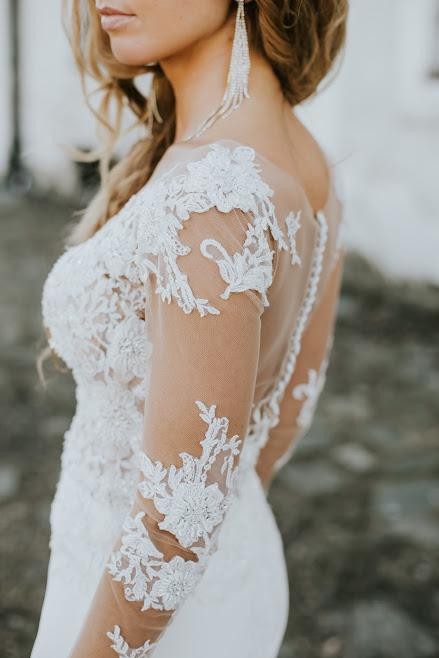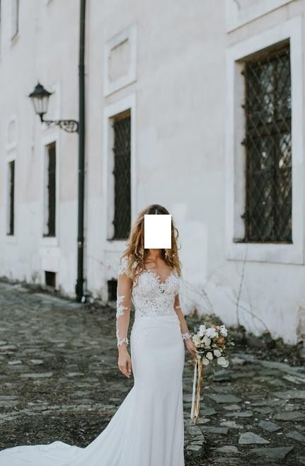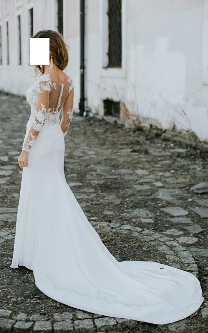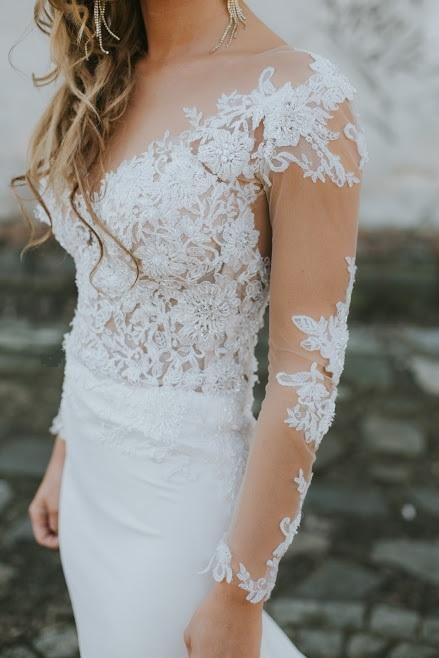 Sukienka jest w kształcie rybki idealnie podkreślającej kształty oraz wysmuklającej sylwetkę. Posiada pięknie zdobioną, lekko połyskującą, koronkową górę, z długimi rękawami, wykrojonymi plecami, zabudowanymi cielistą siateczką. Zapinana na malutkie guziczki. Dół sukienki jest dopasowany w okolicach bioder i lekko rozszerzający się ku dołowi, wykonany z dwóch warstw (wierzchnia lekka, muślinowa). Suknia efektownie prezentuje się zarówno z rozpuszczonym, jak i podpiętym trenem (obydwie warstwy sukni są podpinane). W biuście zostały wszyte miseczki, które w razie potrzeby można zmienić.