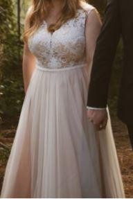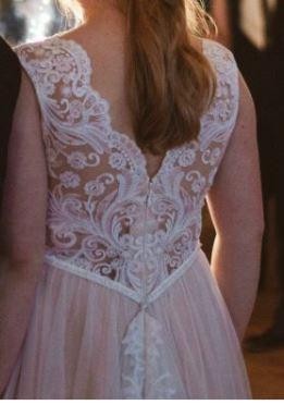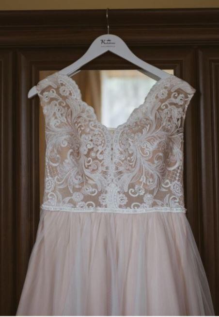 Suknia uszyta jest z satynowego dołu w kolorze NUDE, na to nałożony jest ŚMIETANKOWY tiul. U góry piękna ŚMIETANKOWA koronka, do tego długi welon w tym samym kolorze. Z tyłu jest podwójny tren upinany na guziczki (u dolnej i górnej warstwy sukni) widoczny na zdjęciach. Suknia w stanie idealnym, po czyszczeniu w pralni chemicznej. Suknia jest w rozmiarze około 40 na wzrost 164 cm + 8 cm obcas, w koronkę wszyte są miseczki XXL. Do ceny sukni dorzucam długi welon.