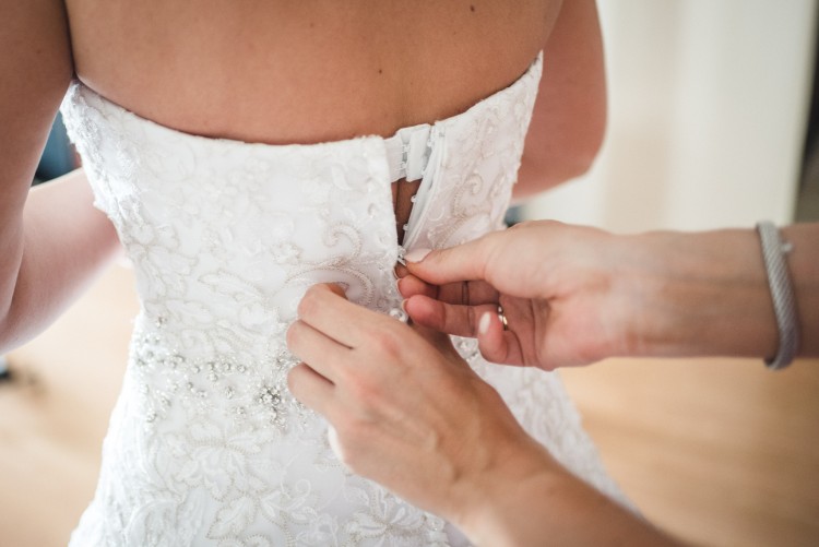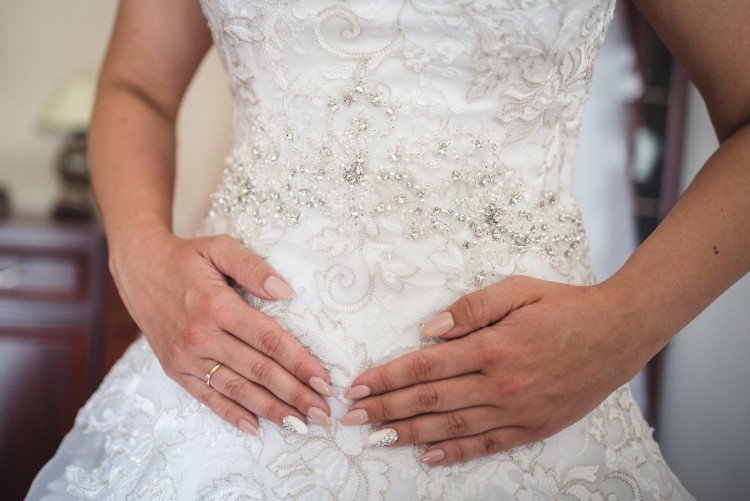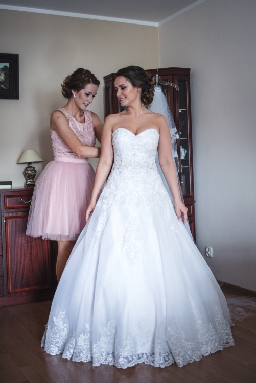 Sprzedam śliczną suknię ślubną w kolorze białym, w kształcie litery A. Gorset oraz dół sukni wyszyte są piękną koronką, a kamienie umieszczone na linii talii dodatkowo ją wyszczuplają i cudownie się mienią. Suknia zapinana jest na haftki (umieszczone od wewnętrznej strony) oraz suwak, na którym naszyte są śliczne kryształowe guziczki prowadzące aż do dołu sukni.