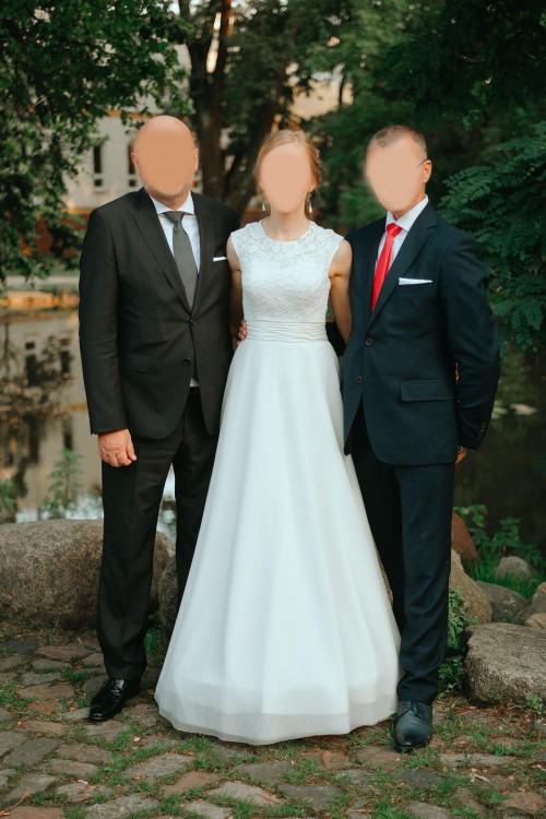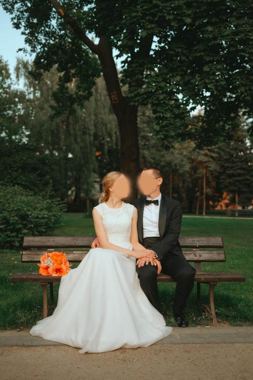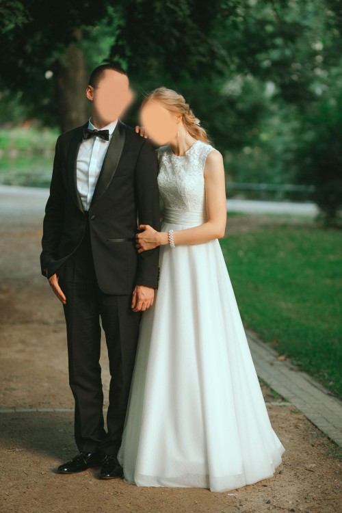 Fason sukni to klasyczne A, łagodny dla kobiecej sylwetki. Dzięki temu nie krępuje ruchów, gustownie prezentuje się w tańcu i zawsze pięknie się układa. W tym konkretnym egzemplarzu drzemie ogromny potencjał, jeśli chodzi o zabawę dodatkami - jej naturalność broni się sama, ale i pokocha wyszukane kompozycje biżuteryjne czy kwiatowe.