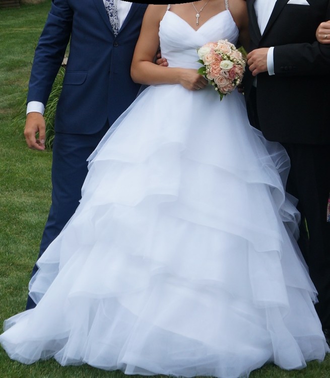 Witam! Mam na sprzedaż przepiękną i zjawiskową białą suknię ślubną Mori Lee model 2873. Suknia założona jeden raz, po praniu chemicznym w stanie idealnym. Uszyta na wzrost 165 cm + 8-10 cm obcas. Wymiary 90cmx60-65cmx90cm. W komplecie oczywiście halka z kołem. Specjalne podpięcie pod falbanami z tyłu sukni umożliwia schowanie trenu przez co można spokojnie bawić się w niej do białego rana. Przepiękne zdobienia na plecach dodają kobiecości, ale również delikatności każdej pannie młodej, która ubierze tą suknię. Ubrana na żywo zapiera dech w piersi i zachwyca każdego. Polecam serdecznie! Jest możliwość dodatkowo zakupu cudownych butów (rozm. 38), bardzo wygodnych i w 100% z prawdziwej skóry. Więcej informacji zapraszam telefonicznie.