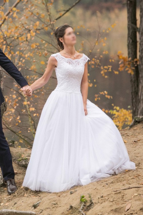 Suknia ma krótki rękaw wykończony koronką. Brak świecidełek, cekinów itp. Plecy z wycięciem w kształcie litery V oraz subtelne guziczki, sprawiają, że suknia jest połączeniem piękna i klasycznej elegancji. Piękne plecy. Przedłużony gorset z tyłu sprawia, że wydasz się smuklejsza. Suknia jest bardzo wygodna i zrobiła ogromne wrażenie na gościach weselnych.