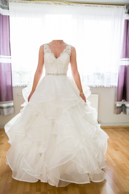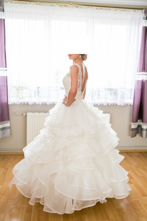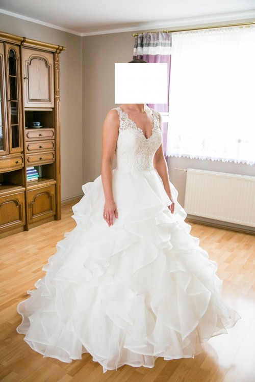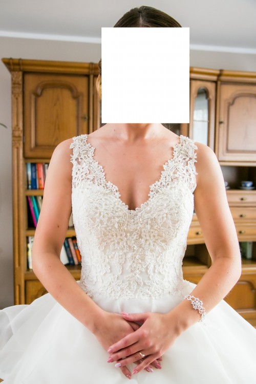 Sprzedam suknię ślubną Mori Lee z kolekcji 2017 w kolorze Ivory. Składa się z warstwowej spódnicy z organzy typu Princess oraz gorsetu haftowanego weneckimi koronkami i kryształkami. Dekolt w kształcie litery V doskonale podkreśla biust i optycznie go powiększa. Wspaniale eksponuje ramiona oraz plecy dzięki wycięciu również w kształcie litery V. Całość dopełnia pasek z satyny wyszywany koralikami. Dodatkowym atutem jest piękny tren, który bez problemu można wpiąć w suknię.