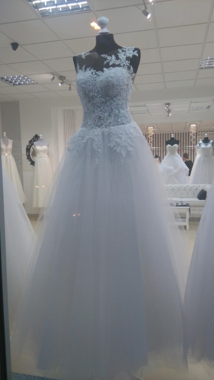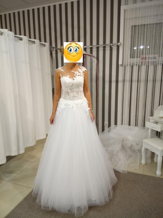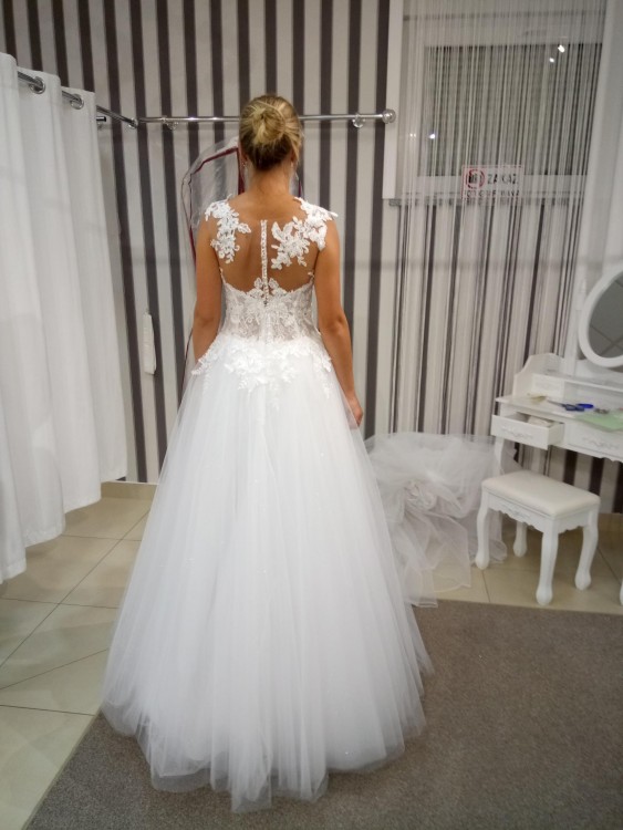 Śnieżnobiała suknia ślubna MS Moda model Arsenie 2017. Wyszyta jest przepiękną, idealnie wykończoną asymetryczną koronką. Tył sukni zapinany ozdobnymi guziczkami. Tiulowy dół pokryto pyłkiem/brokatem, który pięknie się mieni przy każdym ruchu.
