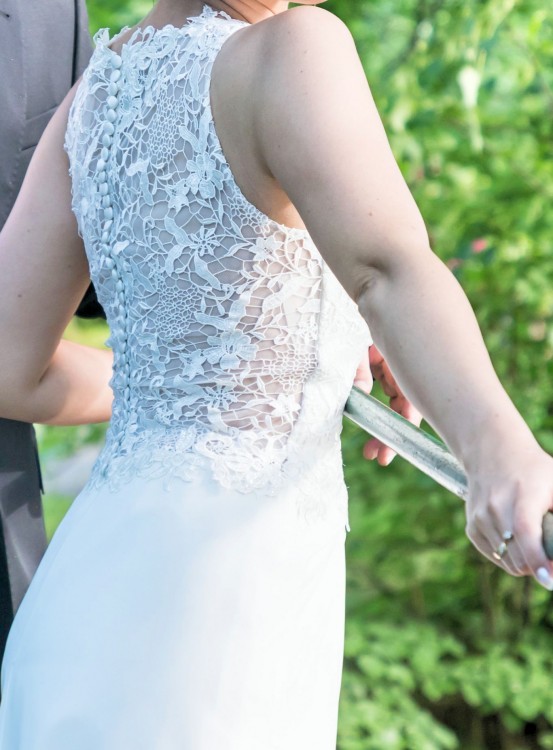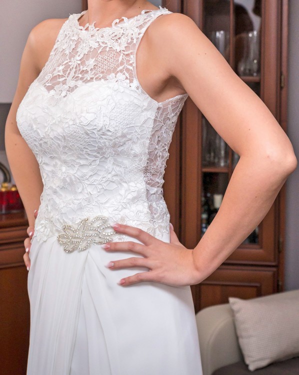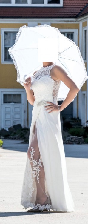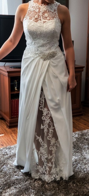 ponieważ jest lekka i zwiewna, nie krępuje ruchów. Atutem sukni jest piękna koronkowa góra z tyłu ozdobiona guziczkami oraz rozcięcie w dolnej części ozdobione koronkowa halką. Suknia jest w rozmiarze 34/36, na wzrost 168 cm plus obcas ok 8 cm.