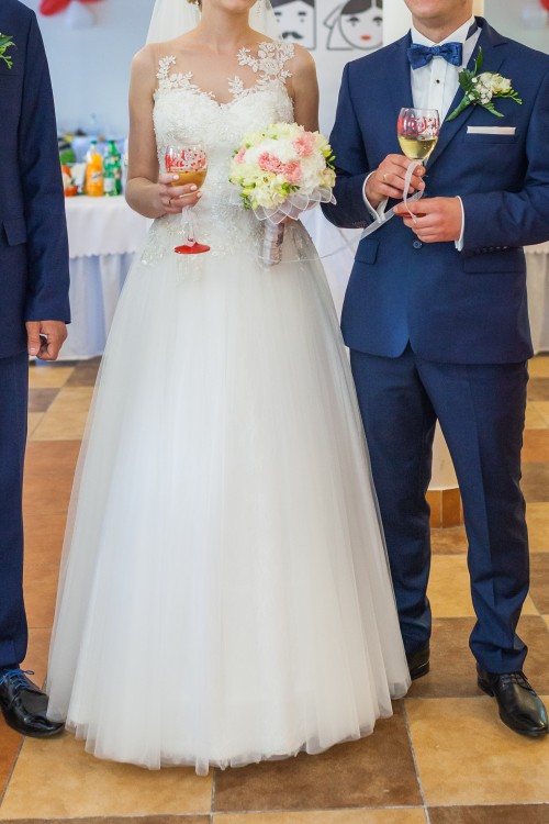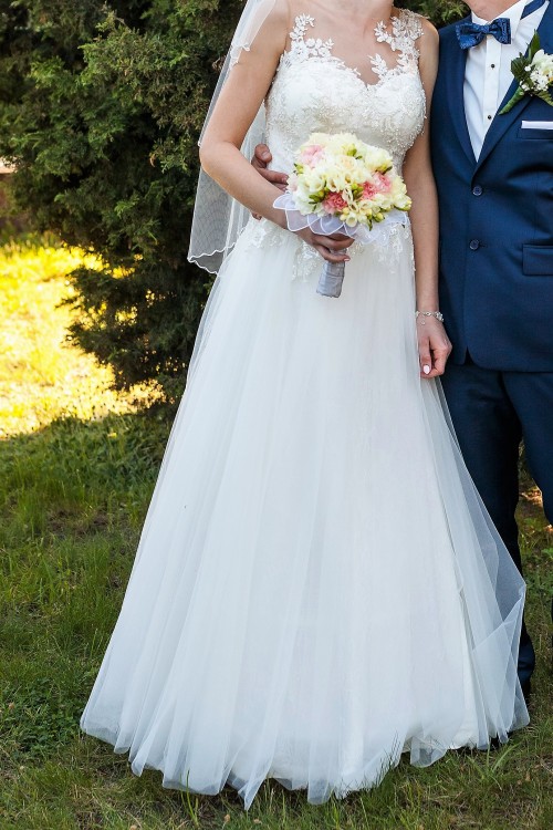 Sprzedam Suknie Ślubną firmy MS Moda Shakira z kolekcji 2017 zakupioną w Salonie Sukien Ślubnych Laura. Dół sukni z koronki, rozmiar 36-38 szyta na wzrost 167 cm +obcas 8 cm. Prana chemicznie. Do sukni dorzucam welon i koło.