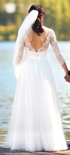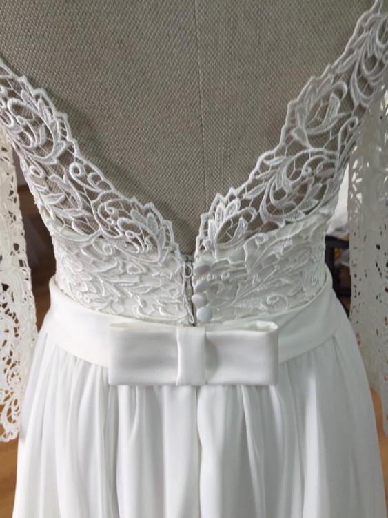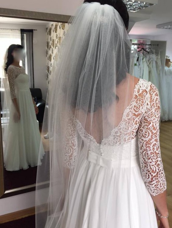 Największą ozdobą sukni jest góra uszyta z pięknej gipiury oraz dekolt na plecach. Dół zrobiony jest z pięknie układającego się muślinu, a pas ozdobiony srebrną aplikacją, z tyłu wykończony delikatną kokardką. Do sukni wszyte są poduszeczki, co daje duży komfort podczas poruszania się, a biustonosz nie jest konieczny. Model szyty na miarę, na osobę o wzroście 173 cm + 7 cm obcas. Rozmiar sukni - 36 / 38. Dodatkowo cena zawiera długi welon.