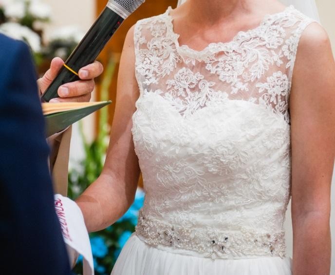 - bolerko z pięknej koronki, bez rękawów, zapinane z tyłu na guziczki. Bolerko jest przypinane na zatrzaski do sukni, dzięki czemu nie podnosi się i też przytrzymuje suknię.