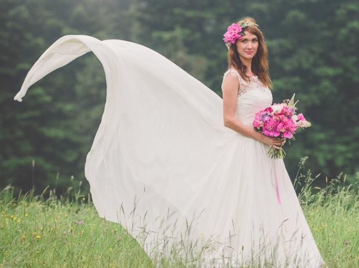 Suknia ma 7 warstw, na samym wierzchu muślin, który nadaje jej zwiewności, pod spodem kilka warstw tiulu, który nadaje jej kształt, a dalej dwie podszewki. Nie wymaga zakładania koła. Cudownie wiruje w tańcu :)