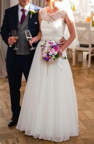 Muślinowa suknia ślubna z pięknym koronkowym bolerkiem i pasem z kryształkami Swarovskiego