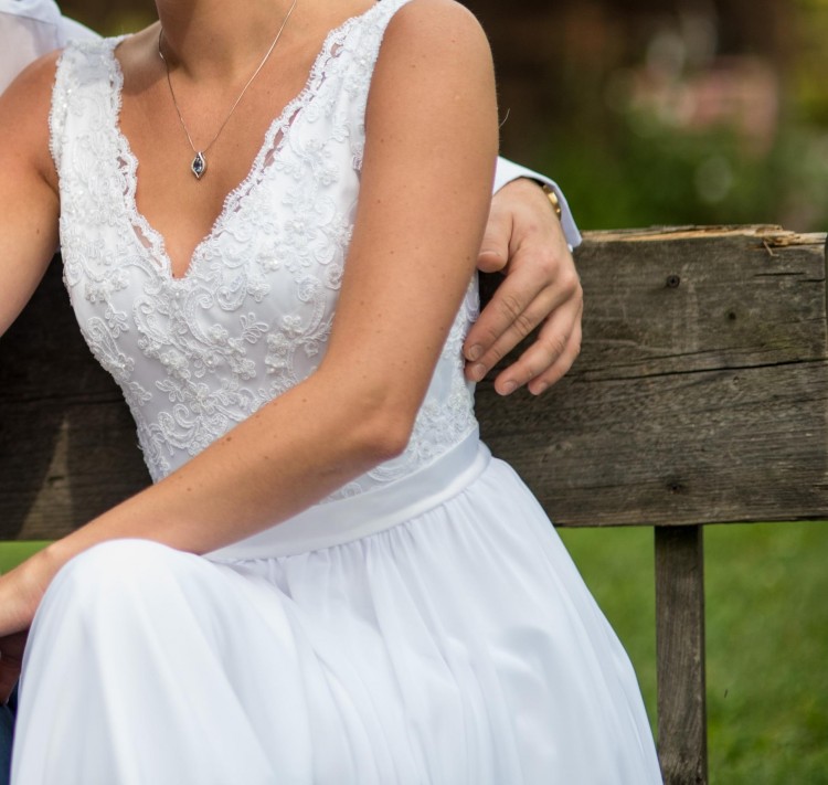 W trakcie ślubu odpadła jedna haftka z tyłu przy zapięciu, jednak doszycie jej nie będzie dużym problemem.
