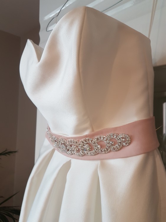 Kokardka z tyłu sukni jest odpinana, aby móc przypiąć różowy satynowy pasek z cyrkoniami. Dzięki temu suknia na sali weselnej może zyskać całkowicie odmienny charakter.