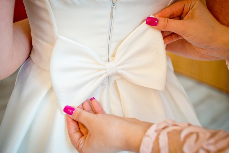 Suknia jest zapinana z tyłu na suwak, ale dodatkowo posiada gorsetowe sznureczki niewidoczne na zewnątrz, dzięki którym góra sukni może być idealnie dopasowana do figury.