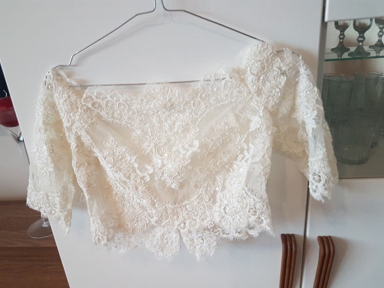 Do sukni w komplecie sprzedaję koronkowe, zapinane z tyłu na guziki bolerko, wyszywane delikatnymi błyszczącymi koralikami. Cena samego bolerka wyniosła mnie 450 zł.