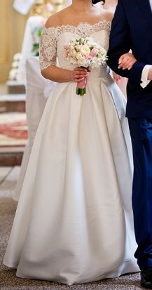Piękna, klasyczna suknia wykonana z materiału mikado w kolorze ecru została zakupiona w salonie Paryżanka w 2016 roku.
