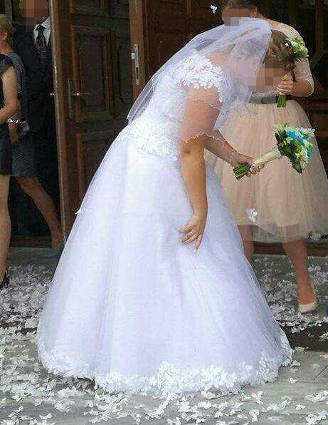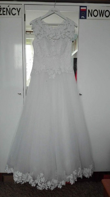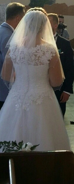 Suknia szyta przez krawcową z salonu Celine w Skarżysku Kamiennej, na rozmiar 40 i wzrost 166cm+ 5cm obcas. Kolor biały. Góra na gorsecie obszyta koronką, dół 5 warstwowy z czego jedna warstwa tiulu jest z brokatem. Dół sukni ozdobiony tą samą koronką, która jest na gorsecie. Zapięcie w postaci suwaka i guzików.