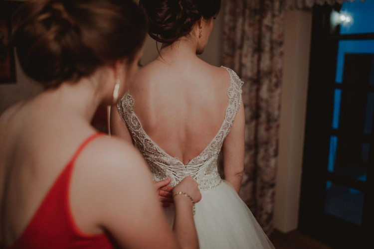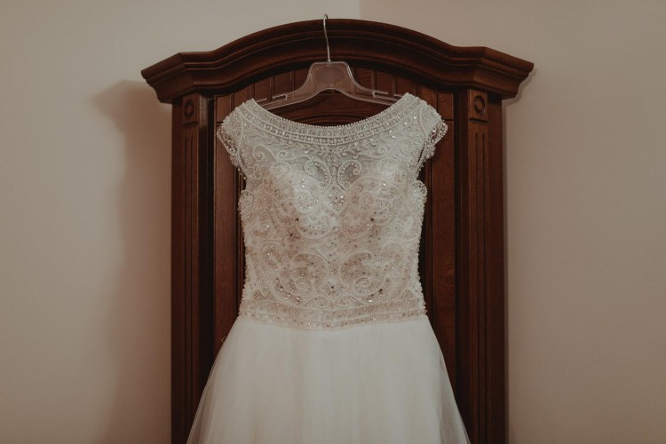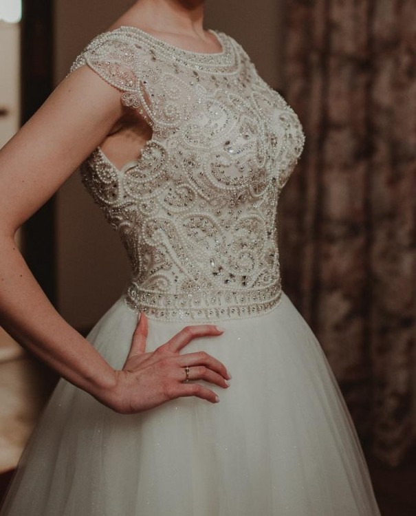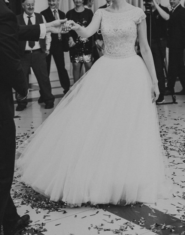 Suknia ślubna idealna dla wysokiej dziewczyny z możliwością łatwego skrócenia + gratisy! Fason lekka księżniczka z dekoltem łódka.