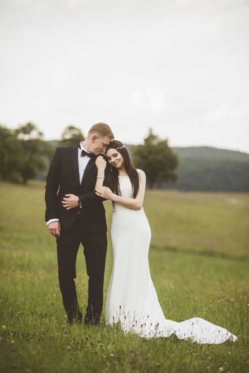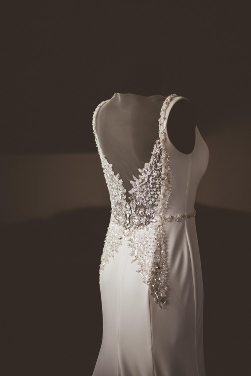Suknia przybiera kształt rybki. Posiada podpinany tren, aplikację biżuteryjną na plecach oraz delikatne zdobienia po bokach i na dekolcie. Pięknie prezentuje się podczas tańca.
