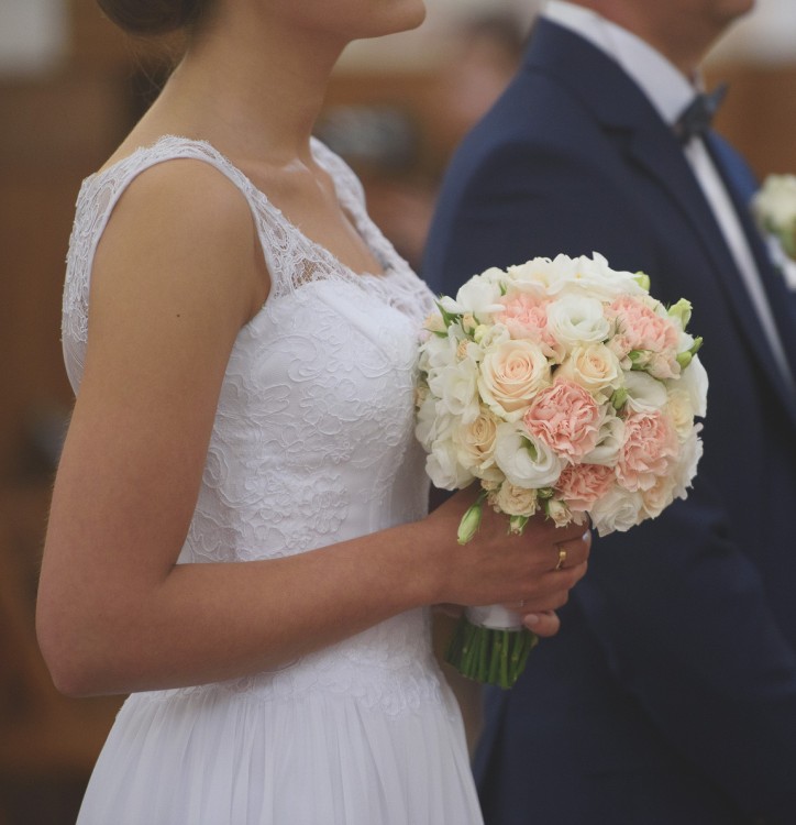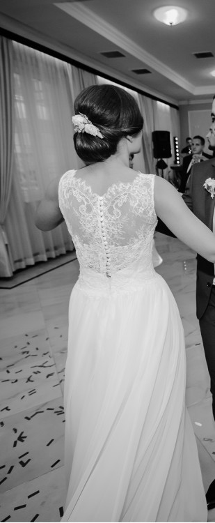 Suknia jest lekka i zwiewna, bardzo wygodna, doskonale podkreśla figurę, pięknie układa się w tańcu. Góra sukni uszyta z delikatnej francuskiej koronki, dół wykonany z muślinu. Na plecach zapinana na guziczki.