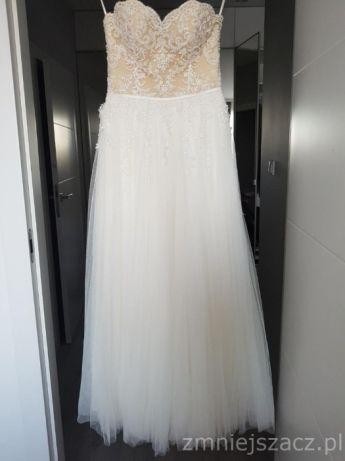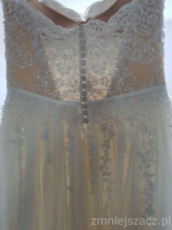 Góra sukni w kolorze cielistym, wyszyta koronką z dodatkiem koralików. Dół sukni jest z tiulu, bardzo przyjemnego w dotyku.